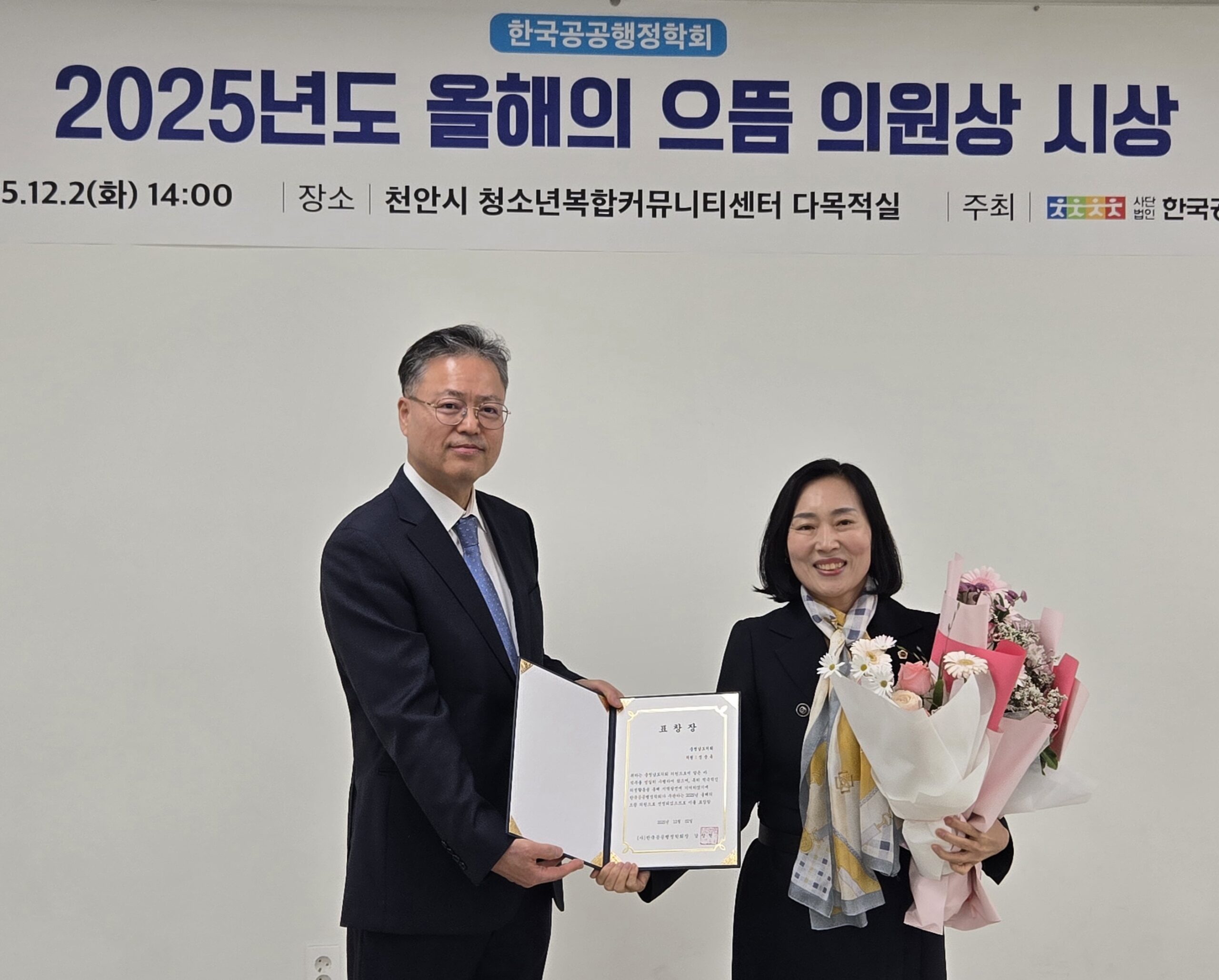 여성·노인 등 사회적 약자 보호와 도민 안전·복지 증진 정책 높은 평가 받아 “도민의 일상이 더 안전해지는 충남을 위해 흔들림 없이 일하겠다” 충남도의회 신순옥 의원(비례·국민의힘)이 2일 천안시청소년복합커뮤니티센터에서 열린 ‘2025년 올해의 으뜸...