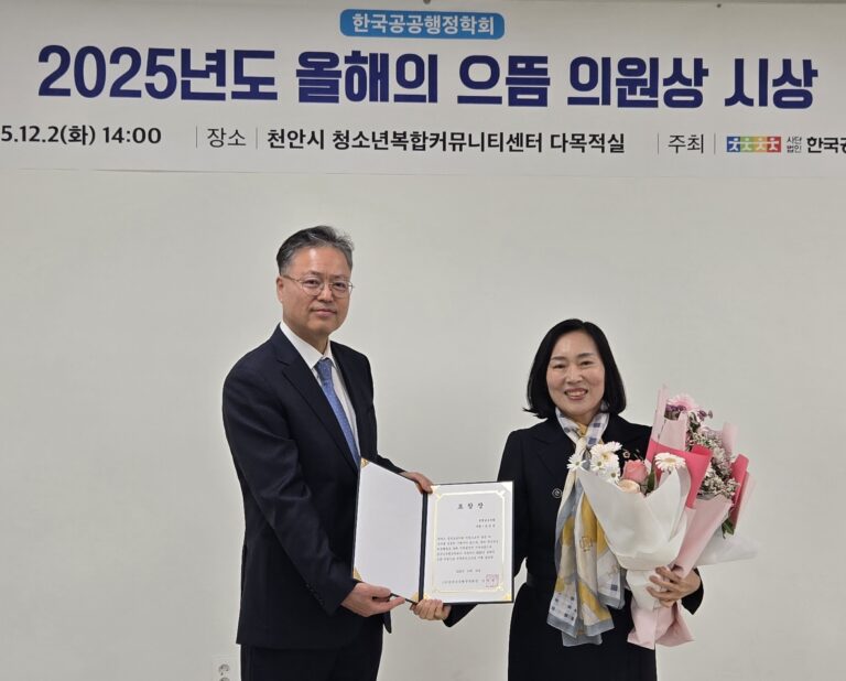 충남도의회 신순옥 의원(비례·국민의힘)이 2일 천안시청소년복합커뮤니티센터에서 열린 ‘2025년 올해의 으뜸 의원상’을 수상했다고 밝혔다. (사)한국공공행정학회는 도민의 목소리에 귀 기울이고 적극적이고 성실한 의정활동을 통해 지역발전과 공공성 강화에 기여한 의원을 선발해 시상하고 있으며, 신순옥 의원은 사회적 약자 보호와 복지정책 강화에 기여한 공로를 인정받았다.