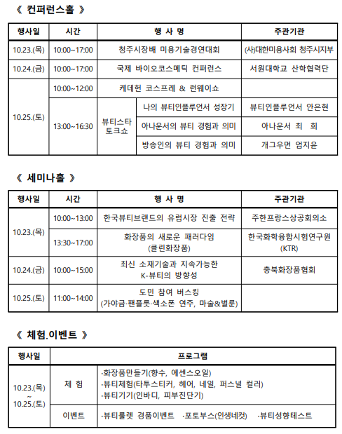 전시홀에서는 기업 간 거래(B2B)와 소비자 대상 판매(B2C)가 동시에 진행된다. 참가 기업들은 우수 제품 전시와 수출상담회를 통해 판로를 넓히고 홍보 기회를 확보한다. 컨퍼런스홀에서는 ‘청주시장배 미용기술경연대회’를 비롯해 ‘국제 바이오코스메틱 컨퍼런스’, ‘케데헌 코스프레&런웨이쇼’ 등 다양한 행사가 열린다.