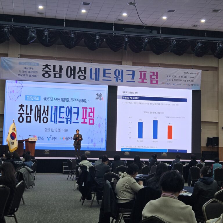 주제발표에서 정효채 충남경제진흥원 책임연구원은 ‘충남 여성 고용 현황과 과제’를 발표하며, 충남이 여성가족부가 지난 4월 발표한 지역성평등지수에서 상위 등급을 받았다고 밝혔다. 지역성평등지수는 양성평등기본법에 따라 국가성평등지수를 기초로 지역의 성평등 수준을 지수화한 것으로, 여성 관리자 비율과 고용률, 상용근로자 비율, 경력단절 비율 등 7개 영역 20개 지표를 종합해 산출된다.