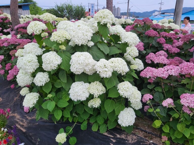유구천 수변공간을 따라 지난 2018년부터 조성된 유구색동수국정원은 중부권 최대인 총 4만 3000㎡ 규모로 앤드리스썸머, 핑크아나벨 등 22종 1만 6000본에 달하는 수국이 만개해 장관을 이루고 있다.
