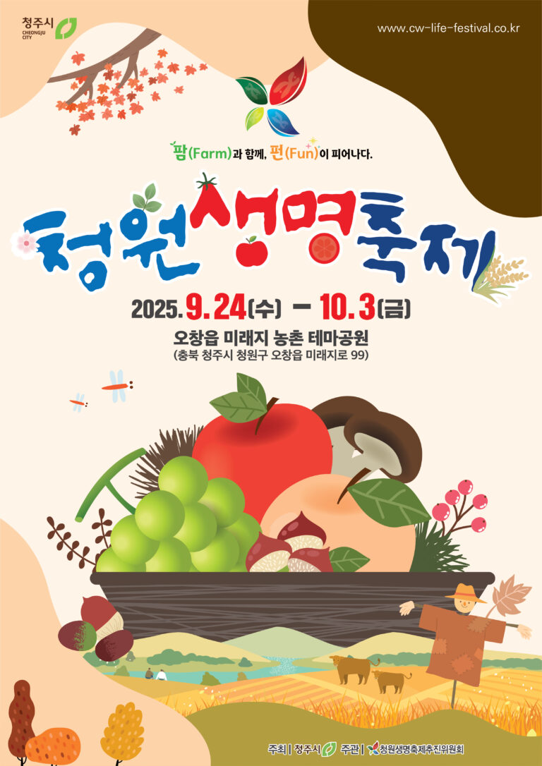 청주의 대표 농축산물 축제인 2025 청원생명축제가 오는 9월 24일부터 10월 3일까지 10일간, 청원구 오창읍 미래지농촌테마공원에서 열린다. 2008년 ‘생명’을 키워드로 시작된 청원생명축제는 해를 거듭하며 규모와 내실을 동시에 키워왔으며, 이제는 중부권을 대표하는 농업문화축제로 자리매김했다.