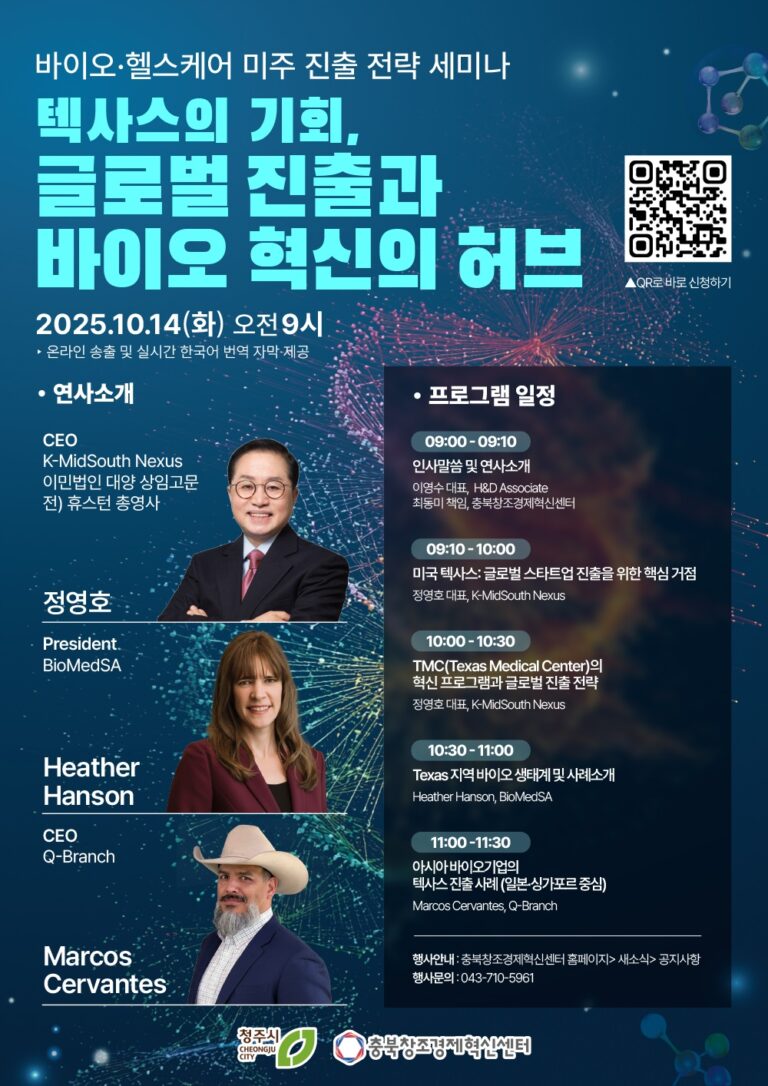 청주시와 충북창조경제혁신센터는 바이오분야 창업기업의 글로벌 진출을 지원하기 위해 14일 온라인 세미나 ‘텍사스의 기회 : 글로벌 진출과 바이오 혁신의 허브’를 개최했다. 이번 세미나는 한국 바이오 기업의 글로벌 진출 전략과 함께, 세계 최대 바이오 클러스터 중 하나인 미국 텍사스 지역의 혁신 생태계와 협력 기회를 심도 있게 다뤘다.