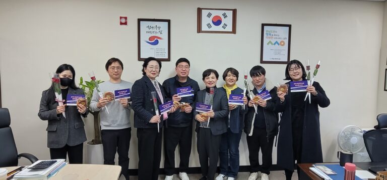 이에 충남사회서비스원은 3월 5일~ 3월 7일 동안 공주사무실(3.5), 내포사무실(3.6), 천안사무실(3.7)을 방문하여 기관의 여성노동자들에게 세계 여성의 날 안내 리플렛과 장미, 빵을 나누며 여성노동을 존중하고 의미를 되짚었다