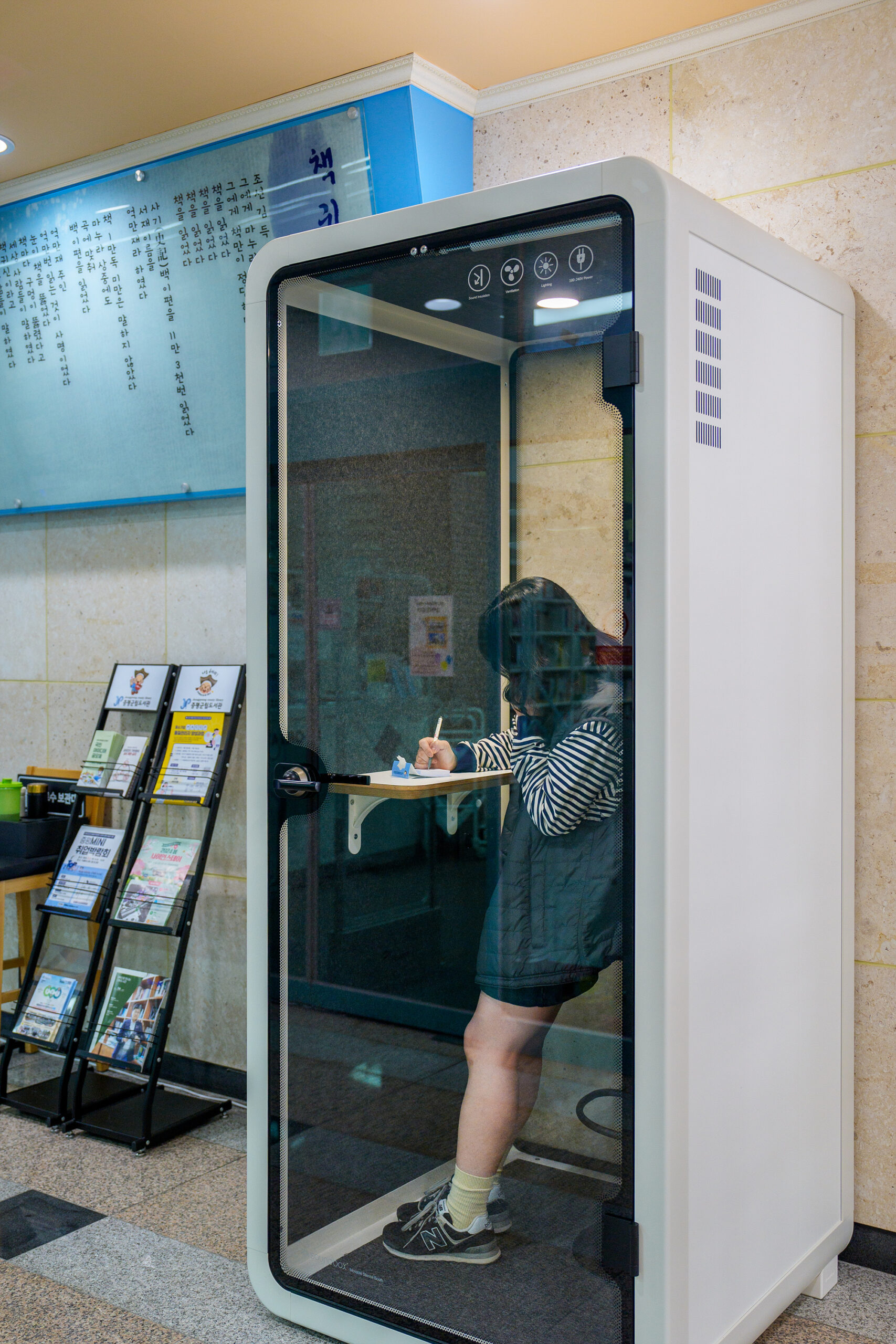 도서관 내 휴대전화 통화 부스 설치 충북 증평군은 도서관 이용자들의 편의를 위해 군립도서관 2층 종합자료실 복도에 휴대전화 통화용 방음부스를 설치했다고 밝혔다. 그동안 도서관 이용자들은 전화가 오면 건물 밖으로 나가거나 계단으로 달려가는...