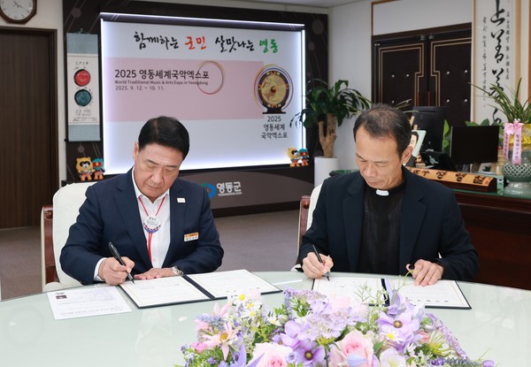 천주교 청주교구, 영동국악엑스포 성공에 힘 보탠다! 2025영동세계국악엑스포 조직위원회(공동조직위원장 김영환 충북도지사, 정영철 영동군수)는 천주교 청주교구(교구장 김종강 시몬주교)와 지난 8월 26일(화) 영동군청에서 2025영동세계국악엑스포(이하 국악엑스포)의 성공 개최를 위한 업무 협약을 체결했다고 27일 밝혔다....